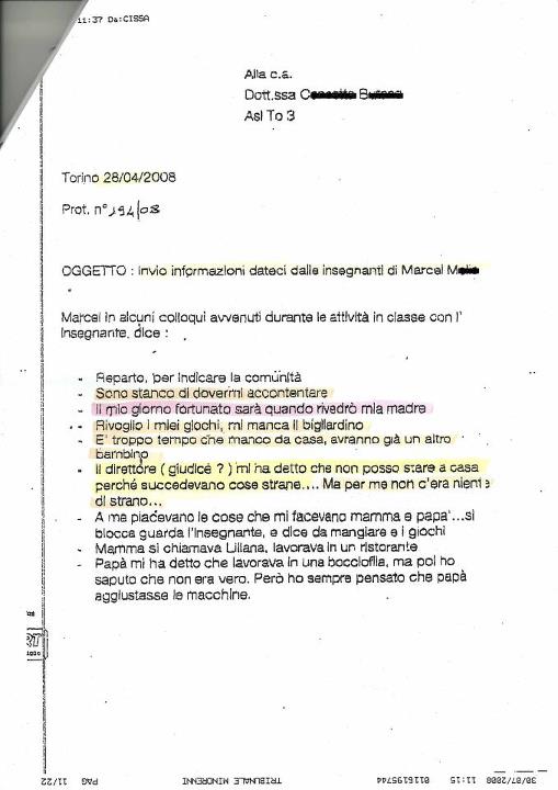 Finché un giorno dopo più di 3 anni, preso dalla disperazione ha chiesto di essere portato nella sua casa anche se i suoi genitori gli facevano cose brutte.. io non so come si possa provocare tanto dolore ad un bambino così piccolo, e mai avrei potuto pensare che potesse accadere al mio bambino.. e non cosa potrete pensarne voi, ma di quale origine avessero queste cose brutte non gli è mai stato chiesto, e credo sarebbe stato chiaro a chiunque che il mio povero Marcel, dopo più di 3 anni senza la sua mamma, avrebbe detto qualsiasi cosa pur di tornare a casa e mi pare solo che le cose brutte siano la scusa che gli è stata ripetuta per anni per giustificargli il suo rapimento.